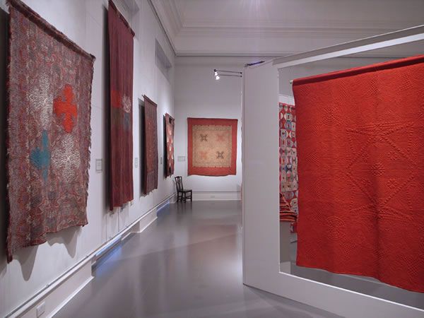 Our second exhibition, showing more quilts from the Jen Jones Collection in a stunning display designed by Gwenllian Ashley, demonstrated further aspects within the wide and wondrous spectrum of Welsh quilting. We focused on “Paisley” and “Turkey Red”. Included were the rich textured paisley shawl quilts, paisley panel quilts, patchworks & wholecloths incorporating paisley and red.